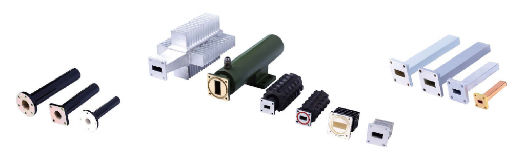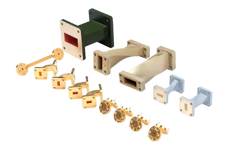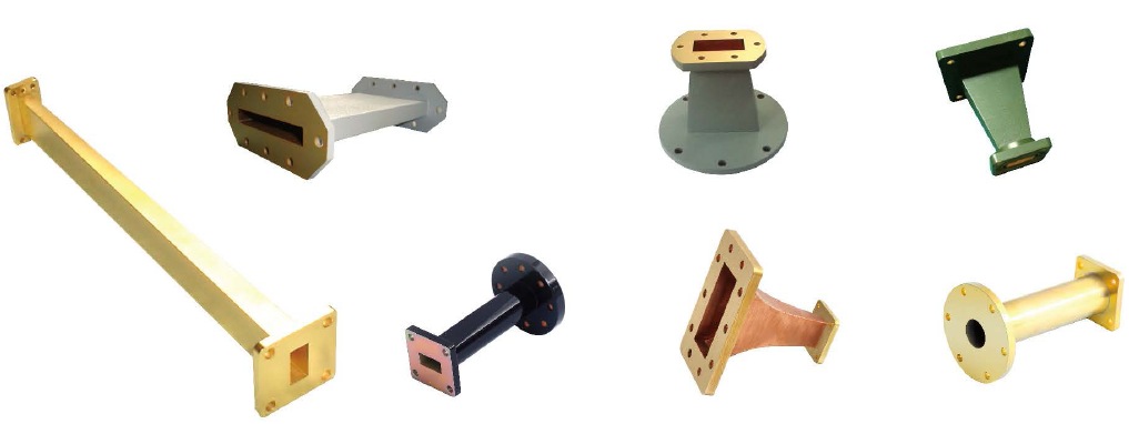 直、彎、扭波導,覆蓋1.13~110GHz,矩形波導BJ14到BJ900。雙脊波導覆蓋0.84~40GHz,從24JS840到24JS18000。材料:銅質、鋁材、不銹鋼、電鑄銅質,彎波導有切角和圓弧彎。